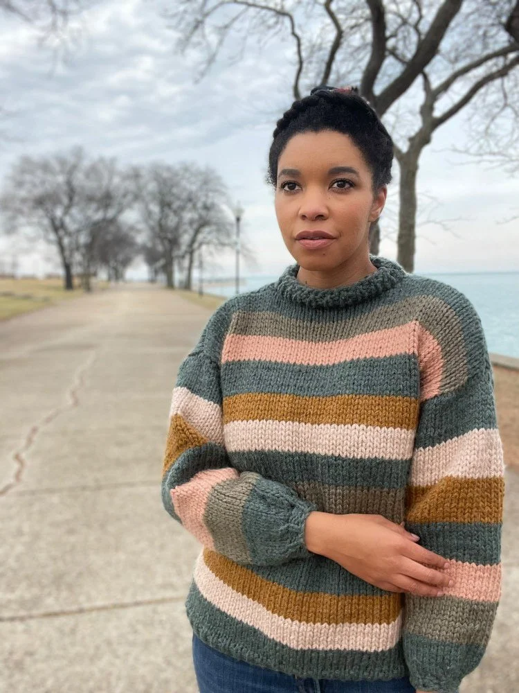 New Hue is a cozy sweater knit bottom up with seamless sleeves worked top down. Knit in beautiful bulky Hue + Me, its meditative striping colorwork, ribbed hem, and comfy neckline make it a fun and indulging seasonal knit for the intermediate knitter or ambitious beginner - just in time for the new year!